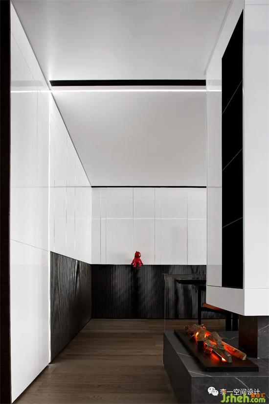 我們將南面的客房空間打造成可以書寫、辦公以及飲茶娛樂的交互空間,裝修設計通一套包圍的“7”字型元素對建筑原承重墻進行視覺再創(chuàng),實現(xiàn)了客廳與休閑區(qū)的分離且交互,使得電視墻與交互區(qū)的收納得到實現(xiàn),也在無法更改開窗面積的情況下最大化實現(xiàn)自然光的室內(nèi)引入,同時有效的實現(xiàn)了公共區(qū)與休息區(qū)的分割。