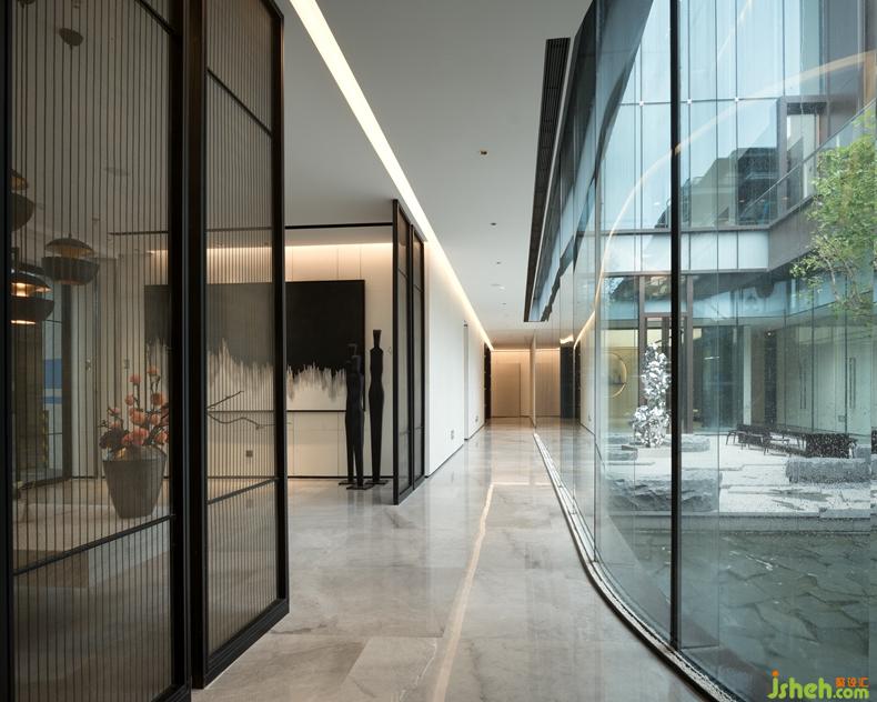 負一層入口處,中庭的立體生態(tài)園毗鄰著健身房,來此健身的人們·沐浴在綠林中,瞬間融入自然,感受自然的魅力。