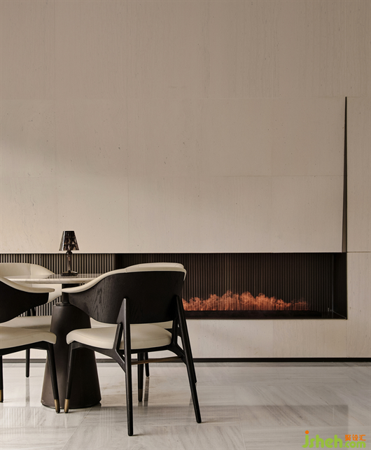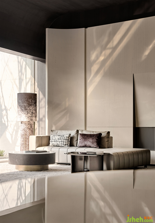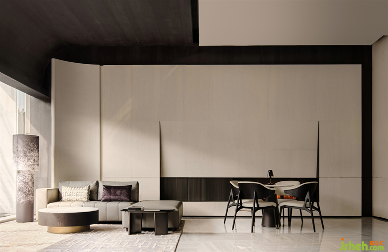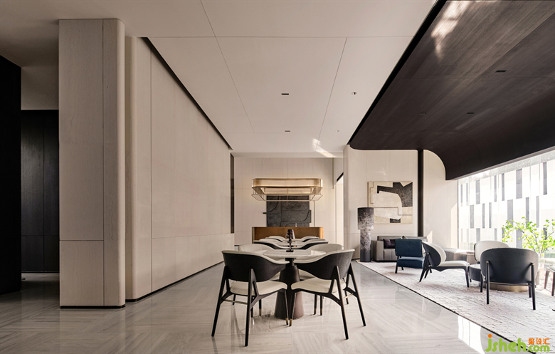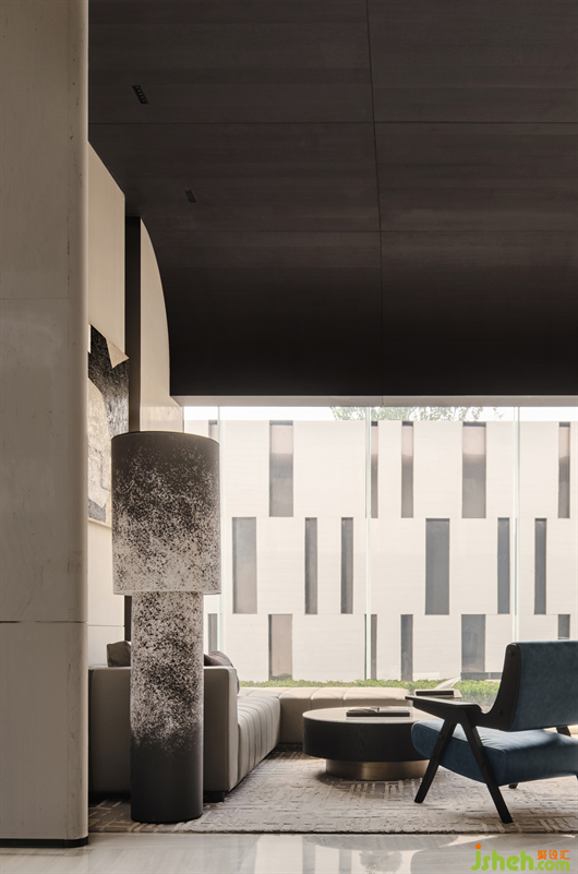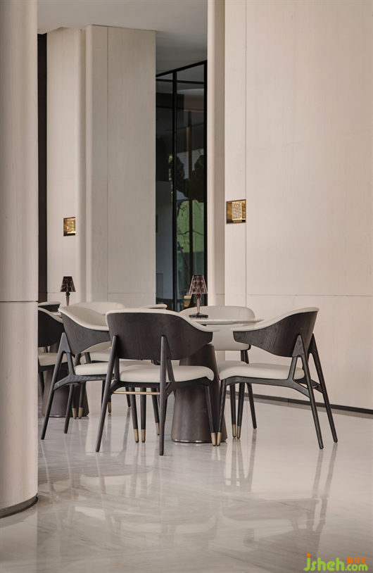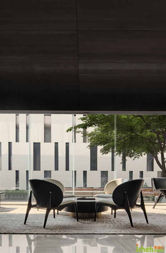 剪水盈波,樹影搖曳,為了讓人們的視線能聚集于身旁的景致,洽談區(qū)的界面設計暗藏了巧思。