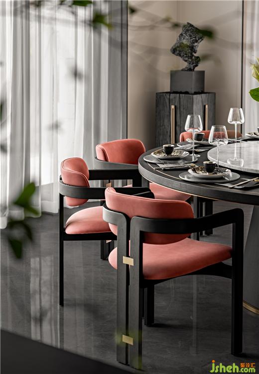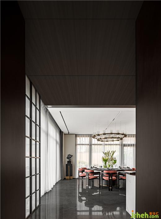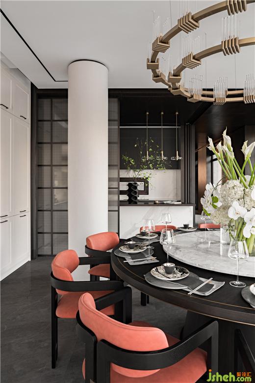 別墅設計大規(guī)格圓餐桌與吧臺滿足東方家庭的團圓與現(xiàn)代簡餐的自由,餐廳與庭院形成聯(lián)動,營造花園般宴會廳情境。