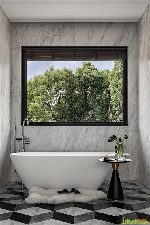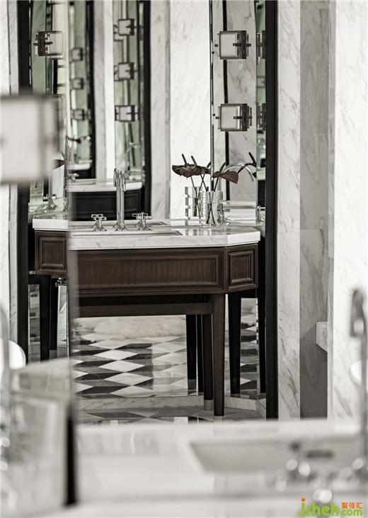 主衛(wèi)在兩端對(duì)稱式擺放了兩個(gè)一樣的盥洗臺(tái),別墅設(shè)計(jì)以鏡面反射鏡面,增加互動(dòng)和趣味,讓空間生動(dòng)起來(lái)。