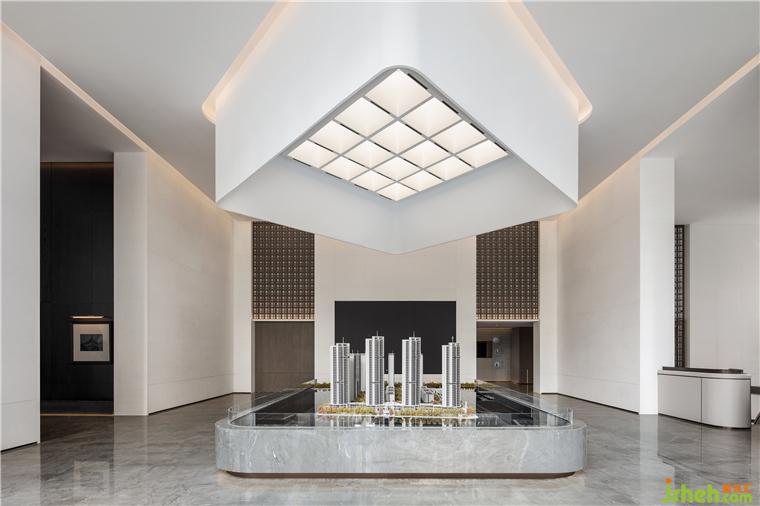 沙盤(pán)區(qū)中心明確,視覺(jué)不需要出現(xiàn)過(guò)多干擾之物,營(yíng)銷(xiāo)中心設(shè)計(jì)師用統(tǒng)一的單色石材確定了干凈、簡(jiǎn)潔的立面控制。天花造型吸取了古代建筑中“藻井”的特點(diǎn),設(shè)計(jì)師采用現(xiàn)代化的藝術(shù)處理方式呈現(xiàn),以具有分量感的體塊結(jié)合略帶溫暖的燈光,將空間梳理地輕重有別,自然而純粹。