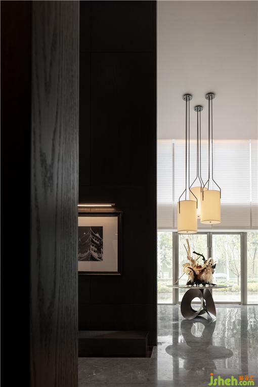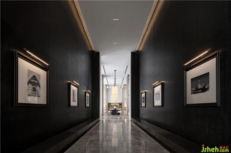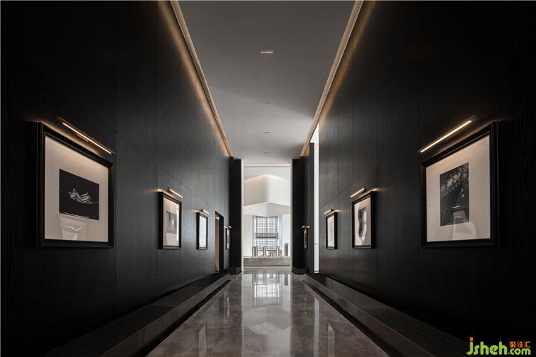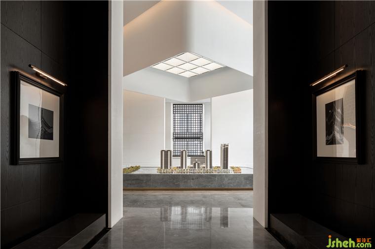 越過(guò)沙盤(pán)深入中庭,需經(jīng)過(guò)一段悠長(zhǎng)的走廊。營(yíng)銷(xiāo)中心設(shè)計(jì)師有意在此降低明度,以深色的界面包裹空間,深邃、肅穆……心理感受產(chǎn)生變化。裝點(diǎn)于墻上的黑白古建筑攝影作,增強(qiáng)了室內(nèi)的藝術(shù)內(nèi)涵與氣息。人們?cè)谛羞M(jìn)的過(guò)程中可一覽太原古城的魅力與豐贍。