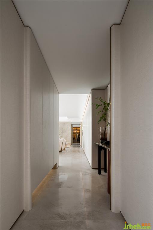 樣板房設計在結構梁較低的一側,采用了鏡面不銹鋼包裹整個天花,擴大空間視覺。整體采用無主燈設計,空間自上而下流暢一體,