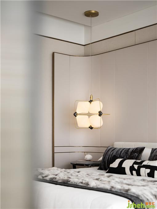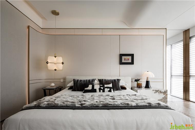 樓上是配套完備的景觀主臥套房,生活空間尺度的擴(kuò)大實(shí)現(xiàn)了主臥的私密性和品質(zhì)感。樣板房設(shè)計(jì)主臥背景墻形如片墻的半圍合型設(shè)計(jì),皮革硬包加以金屬線條收邊的形式,凸顯了精致感。