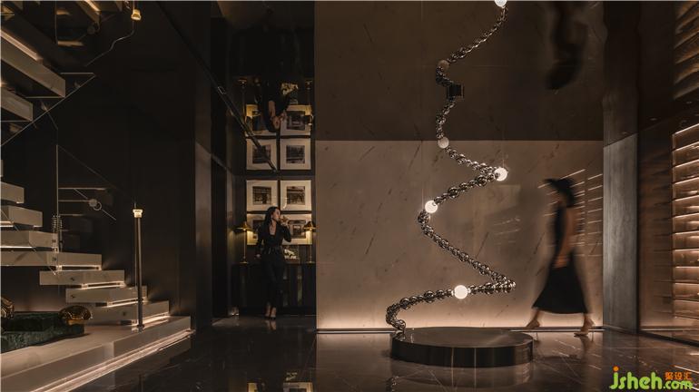 一層入口,以耀眼奪目的珠寶展示區(qū)作為第一體驗區(qū),鑒賞珠寶臻品的藝術魅力。中海寰宇天下會館設計定制的藝術屏風與深色皮革材料,鋪就沉穩(wěn)隱奢的氣氛,熠熠閃亮的燈飾與陳設品,詮釋了空間的獨特之處。