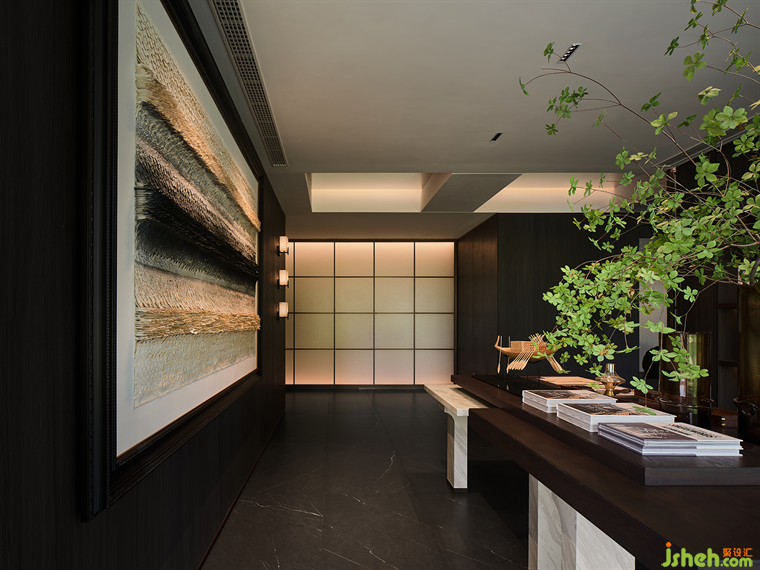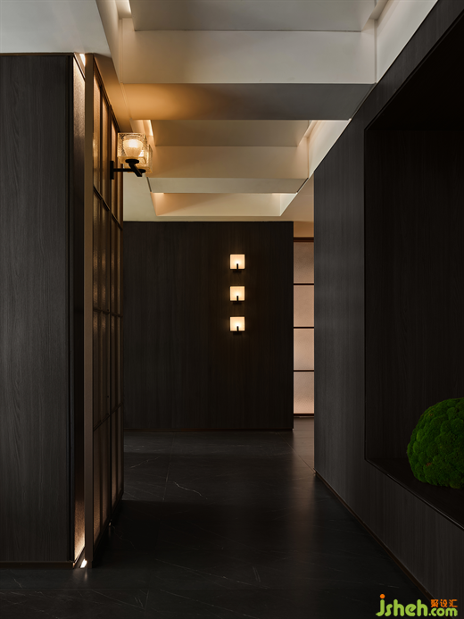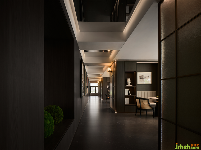 深色的木飾面與玻璃屏風(fēng)的結(jié)合,木作與啞光金屬的銜接,豐富材質(zhì)的觸感,溫馨的燈光照映下,會(huì)所設(shè)計(jì)整體的材質(zhì)色彩搭配,令空間底色是如此地靜雅。