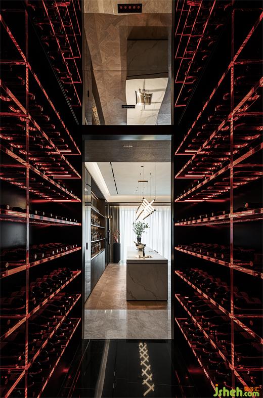 水吧向內(nèi)側(cè)的延伸,是極具展示屬性的酒窖,在用餐的間隙,挑上一瓶紅酒,點(diǎn)染用餐的情調(diào)。