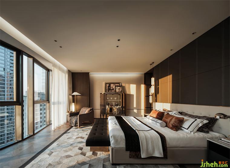 樣板房設(shè)計(jì)利用奢闊的尺度將臥室布局為三段遞進(jìn)式的分區(qū),床對景而立居中擺放,與衣帽間形成洄游動線。