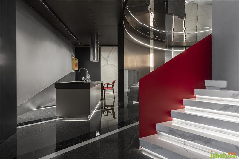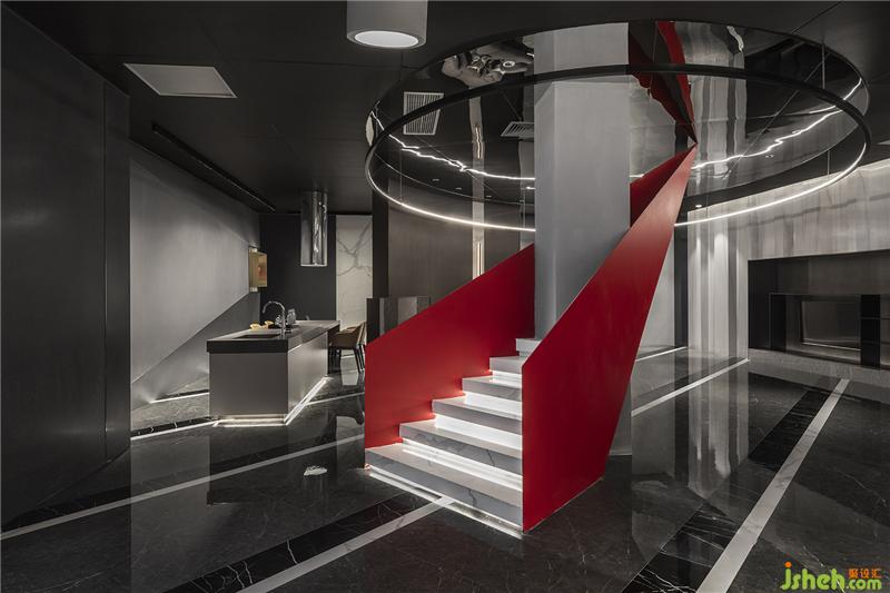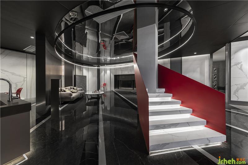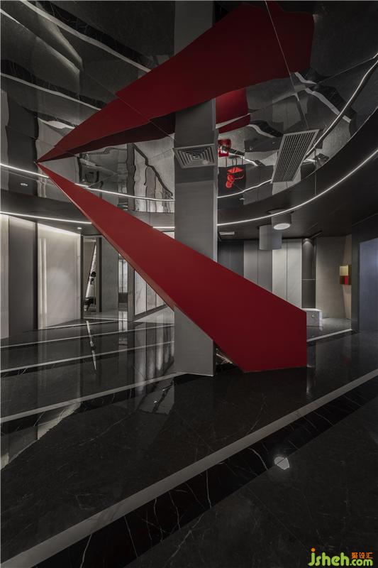 展廳中心的樓梯以匯聚的塊面和鮮紅的顏色宣泄出空間獨特且富于張力的情緒,有著當(dāng)代藝術(shù)的特色并積極調(diào)動參觀者的感官。在“拉伸”的空間中,開闊性和層次感都得以強調(diào)。裝修公司