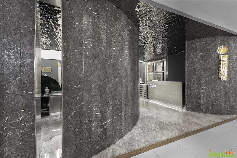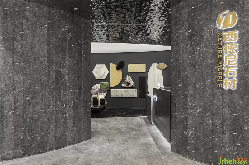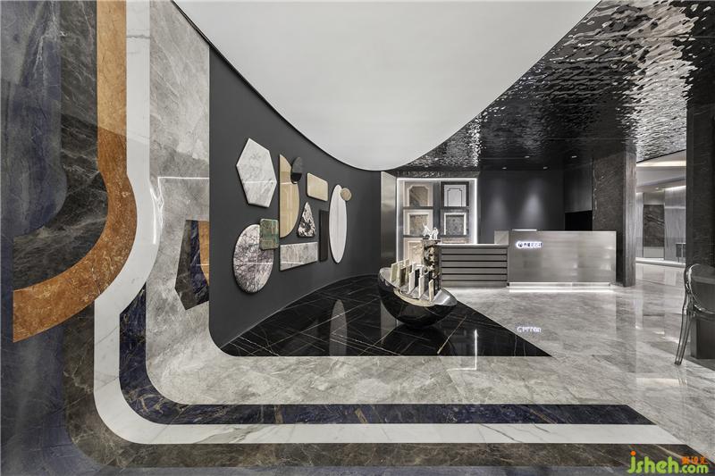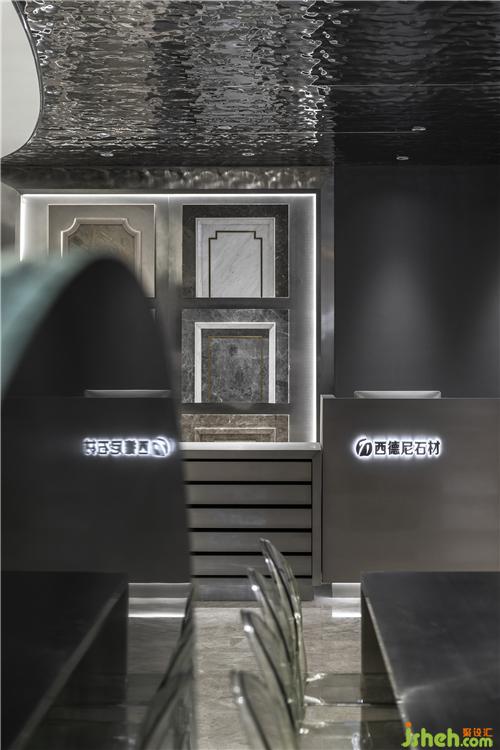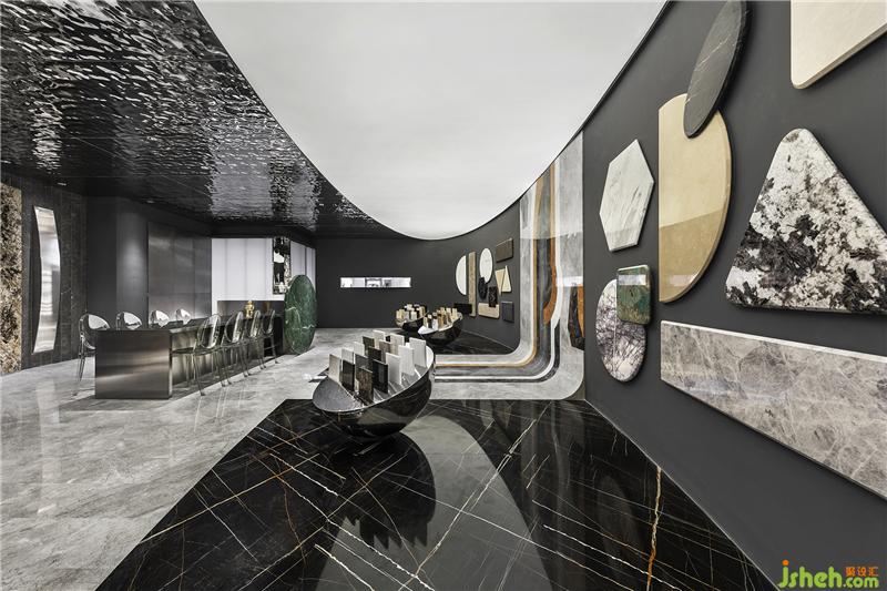 為創(chuàng)作尋找一個(gè)靈感點(diǎn),能夠引導(dǎo)設(shè)計(jì)元素的整合。整個(gè)石材展廳秉持“以全新視角審視石質(zhì)材質(zhì)之間微妙關(guān)系”的原則,由“太空”的靈感出發(fā)對材質(zhì)、人與空間作了全新解讀。閉目幻想置身于浩渺無垠的太空宇宙中,人的身體在懸浮、運(yùn)動的巨大星體面前顯得如此渺小。也正是這種懸殊的狀態(tài),才使我們真切地被星體變幻的色彩和微妙的肌理所震撼,體會“材質(zhì)”的張力和沖擊感。設(shè)計(jì)的每個(gè)細(xì)節(jié)都用心營造視覺上的別開生面,形、色、質(zhì)相互作用傳遞出石材的個(gè)性。