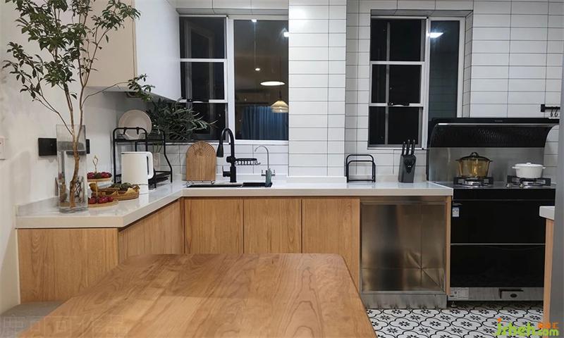 開放式廚房,有兩個(gè)窗,白天采光很好,加上廚房白色的墻磚,整個(gè)空間很通透明亮,改造時(shí)充分利用了空間,做成了G字型的廚房。地面用了黑色的花磚,讓充滿煙火氣的廚房更精致些。