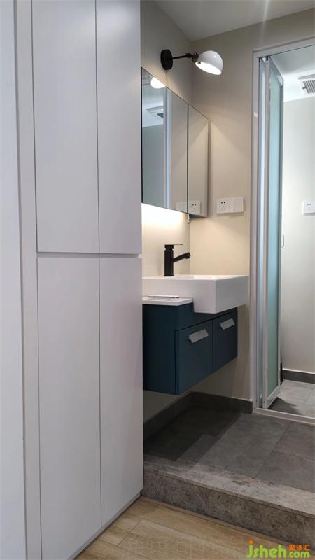 收納柜的功能很強(qiáng),只要位置合理,就會(huì)有他的身影,過道中的收納柜,做的是無把手設(shè)計(jì),好看之余是位置在過道,走來走去可避免撞到。旁邊是外置洗手盆。