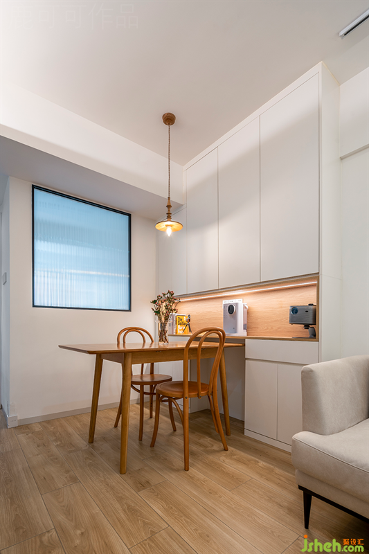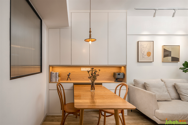 餐廳靠墻做了頂天立地的餐邊柜,啞光白的質感弱化柜子的厚重感。展示中心設計中空位置加了原木元素,放置一些小家電與就餐常用品很方便,不用起身就可以拿到。中空部分用了觸摸式燈帶。