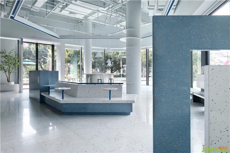 吧臺和制作輕食的半開放廚房被安排在室內(nèi)唯一的墻面區(qū)域,室內(nèi)桌椅的擺放根據(jù)異形的室內(nèi)空間及其動線,散而有序的分布。餐廳設(shè)計