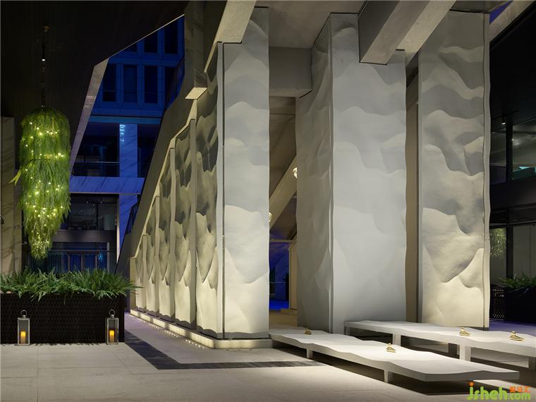 龍庭酒家設(shè)計將戶外中庭納入本次設(shè)計無疑是設(shè)計師和投資方的最佳決策,利用中庭空間,設(shè)計使用數(shù)字技術(shù)模擬“水瀑布”和一塊永不干涸的“水池”,以混凝土制作戶外“水景”,陳列游水“的銅制小鴨子,這一場景恰好通過餐廳窗景傳遞。北京城中少水,更加劇了人們對河流水域的渴求,而北方干燥寒冷的冬天不利于戶外水景營造,設(shè)計借日常生活中最質(zhì)樸的樹木、動物等自然形象,用建筑手法營造自然意向和精神體感,從而化解掉本來理性的建筑形式,厚重傳統(tǒng)的材料輕輕放下,緊張的都市感松弛下來,人們可以盡情享受自然。
