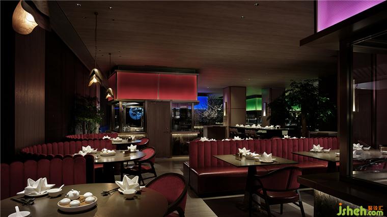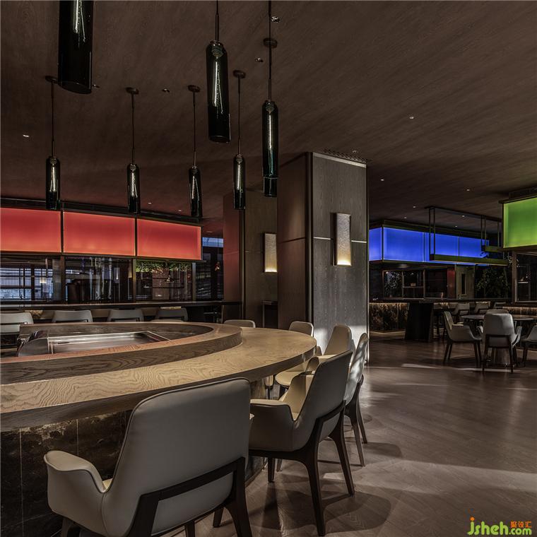 首層明檔散座區(qū)空間,每個島臺以不同顏色標記菜式——廣州花木棉紅代表廣式燒臘;櫻花粉紅代表日式鐵板燒;茉莉的綠色寓意江南冷餐;金黃標記北京烤鴨等。龍庭酒家設(shè)計大膽的色彩運用將就餐區(qū)嵌入戲劇化背景中,明檔廚師更像是舞臺中的演員,體驗層次大大豐富,而素色環(huán)境中的高飽和RGB色也能夠刺激食欲和情緒。