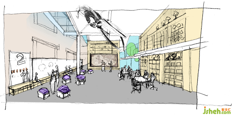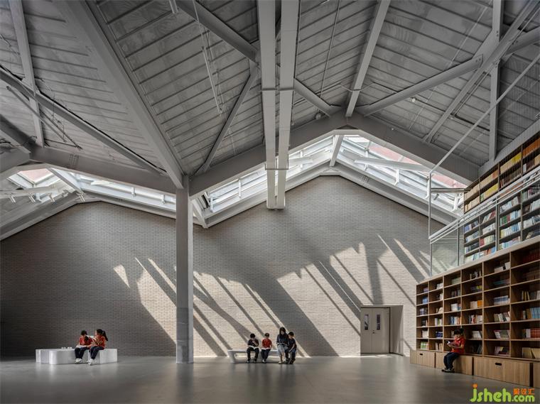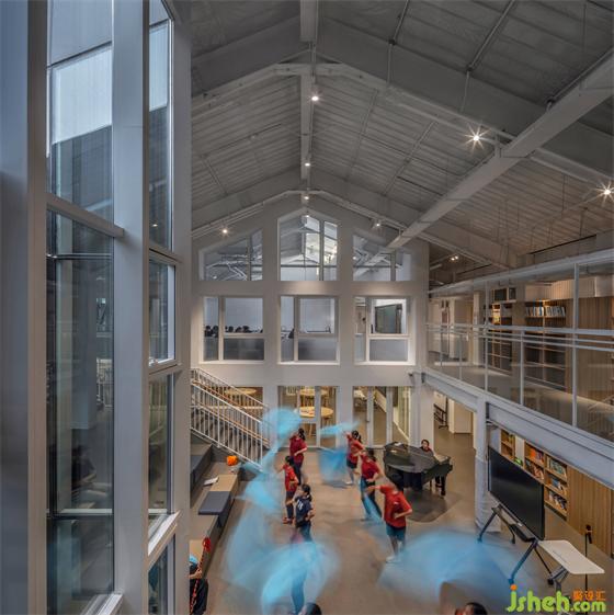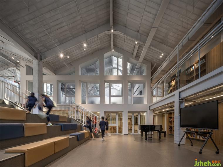 所有教學(xué)空間圍繞兩個大型中庭展開:入口中庭更像一個開放式的圖書館,雙層書架的靈感來源于600多年前的牛津圖書館。演講廣場中庭既連接上下兩層,也延伸了教學(xué)空間,同時,甚至公共的演講也可以在這里展開。學(xué)校裝修設(shè)計屋頂散布的多個天光,一起讓整體建筑靈動而明亮,上下自然聯(lián)通,呈現(xiàn)出動態(tài)的內(nèi)部空間。