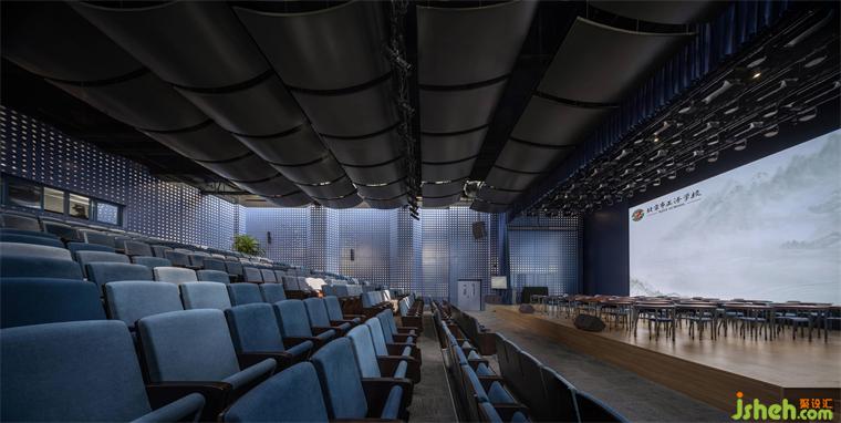 在倉庫空間里支起活動鋼架,使這里可以作為一個300座的階梯式報告廳。這個功能性空間以聲學(xué)設(shè)計為導(dǎo)向:學(xué)校裝修設(shè)計空中懸掛的導(dǎo)聲板力圖讓空間里的每位學(xué)生有幾乎相同的音質(zhì)體驗(yàn)。同時,墻身上的孔洞既達(dá)到吸聲功效,其特殊的參數(shù)化設(shè)計圖形也呼應(yīng)了正澤學(xué)校精神層面“澤”為“水”的意象。
