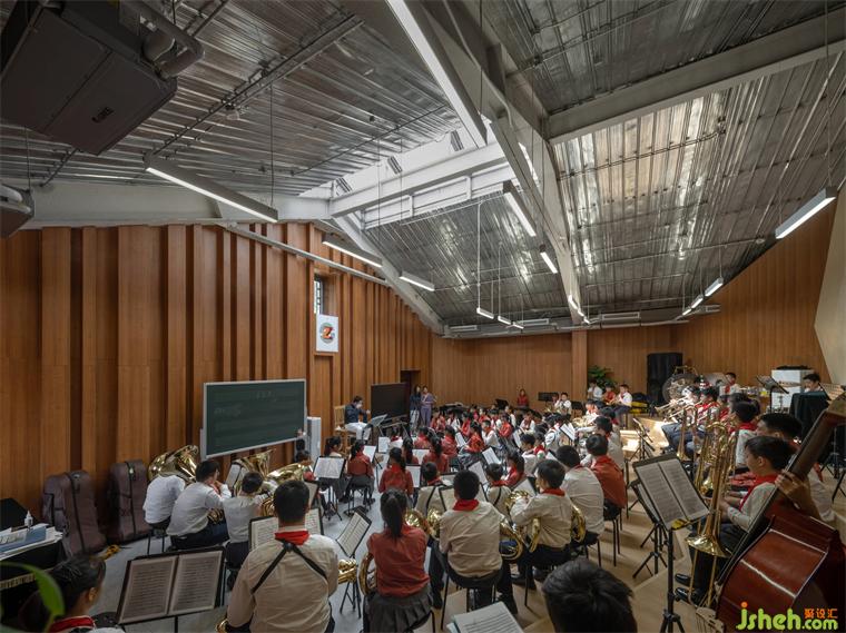 教室空間的設(shè)計(jì)以“適于學(xué)生開(kāi)展各種能動(dòng)、自主的學(xué)習(xí)活動(dòng)、少教多學(xué)”為主要目標(biāo),倉(cāng)庫(kù)打開(kāi)條形窗后,燈光與自然天光照進(jìn)教室,這在高密度的都市校舍中顯得格外珍貴。