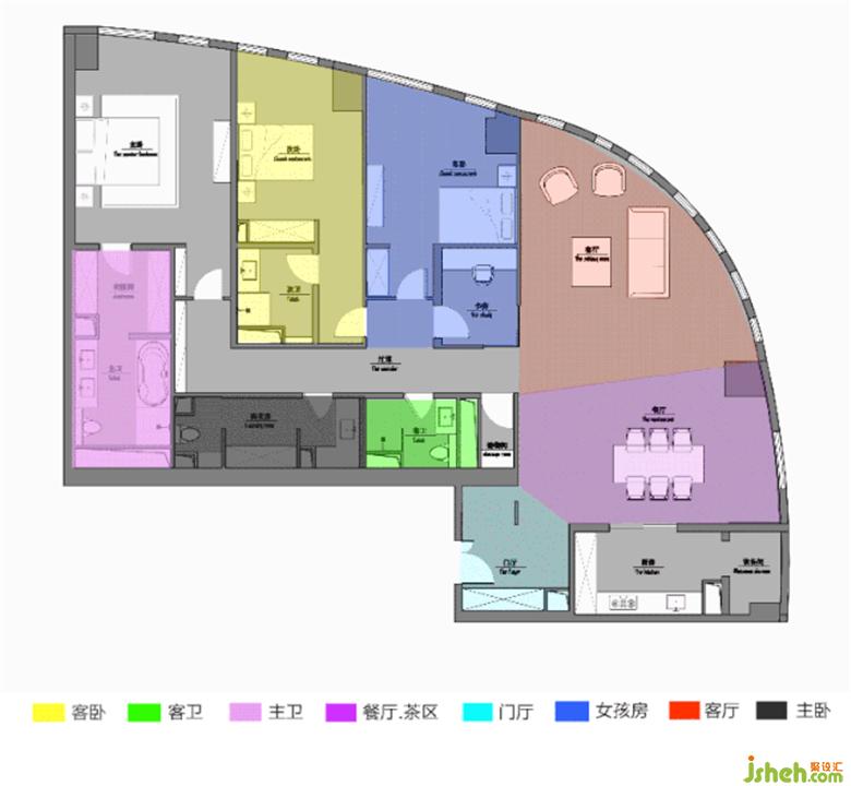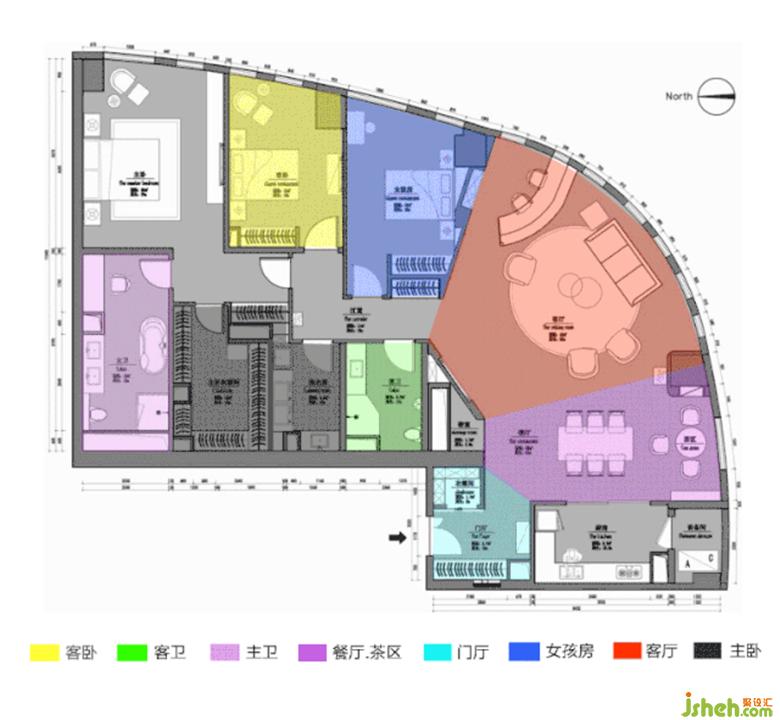1、把空間從固有扇形結(jié)構(gòu)的束縛中解放出來(lái)。平面呈扇形,室內(nèi)大量弧形和非垂直的轉(zhuǎn)角對(duì)空間的利用造成諸多限制,按照慣性思維,是無(wú)論如何都會(huì)出現(xiàn)讓角落閑置的情況。但是,我們堅(jiān)信206平方米的不算小的面積為解決難題提供了可能性。
