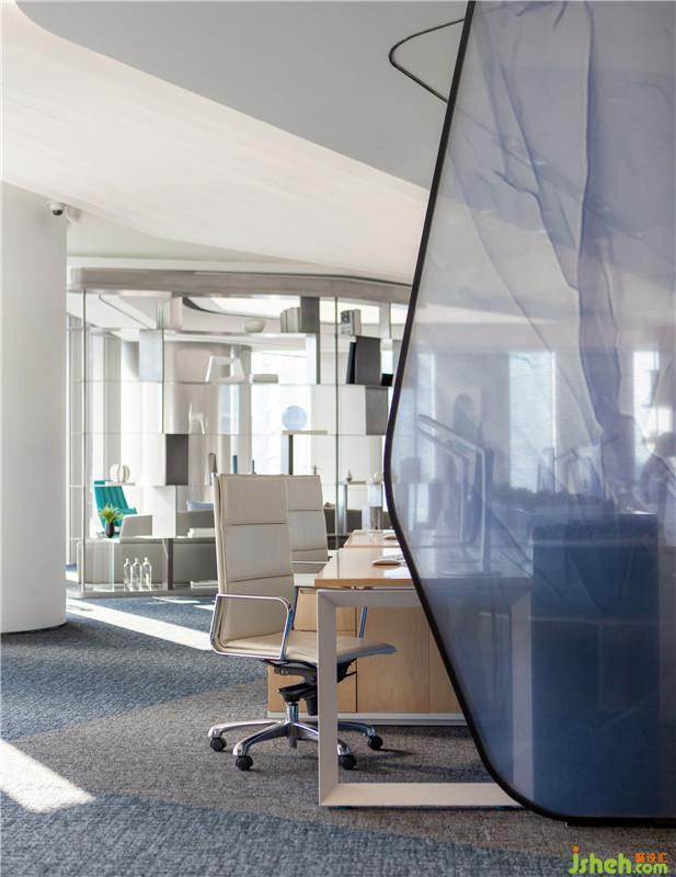 在設(shè)計選材上,設(shè)計師則力求物盡其用,用統(tǒng)一而純粹的材料把“用”發(fā)揮到極致。當極簡的白色亞克力天花在波瀾起伏的造型下,透過玻璃捕捉光的溫度;當高級灰不再作為奢華的唯一表達,而是嘗試以豐富肌理感來呈現(xiàn);當以絹絲綢帶為意向鑲嵌的Tiffany藍藝術(shù)玻璃屏風如靈動的寶石游走于空間,平衡空間未來感中的一抹“溫暖”;當幾何面料的沙發(fā),灰色的地毯和鏡面不銹鋼的茶幾,形成有趣又充滿現(xiàn)代酷感的軟式搭配組合的圍合。一切浮現(xiàn)的簡約未來、輕盈靈動與溫潤質(zhì)感,正是這個空間打動人心的所在。