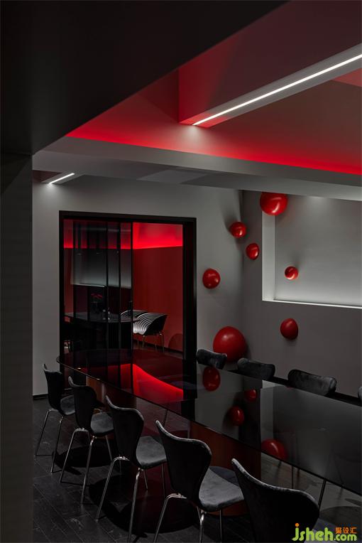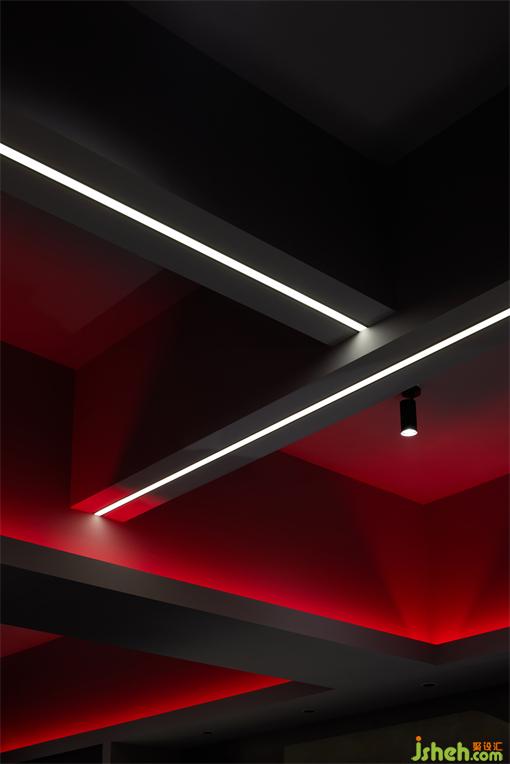 In the color matching of the overall venue, the design team used gray as the main color in a large area. In the processing of the red gradient relationship for the theme expression, it is more inclined to rely on the more variable red light rather than the red wall paint to solve it. On the platforms and ceilings on the first and second floors, RGB color-changing light strips are used for diffuse reflection of red light, and gradient red light is used to render the mysterious and ambiguous atmosphere of the space.