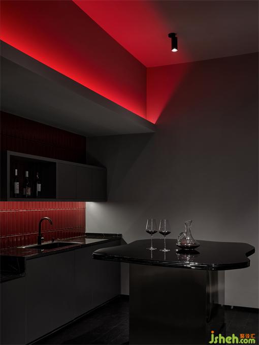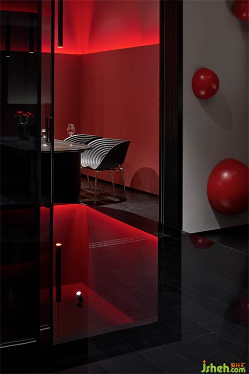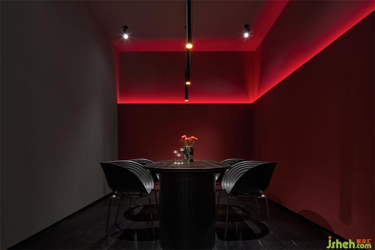 酒莊設(shè)計(jì)整體場(chǎng)地的色彩搭配上,設(shè)計(jì)團(tuán)隊(duì)大面積使用了灰色作為主色調(diào)。在對(duì)于主題表達(dá)的紅色漸變關(guān)系處理上,更傾向于依靠可變性更強(qiáng)的紅色燈光而非紅色墻漆來(lái)進(jìn)行解決。在一層和二層的地臺(tái)、天花部分,利用RGB變色燈帶進(jìn)行紅色光線的漫反射呈現(xiàn),以漸變的紅光,來(lái)渲染空間神秘、曖昧的微醺氛圍。