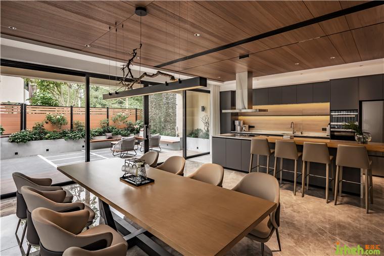 餐廚區(qū)與戶外花園相連,下沉式花園設(shè)計(jì)可以讓采光最大化地引入到負(fù)一層室內(nèi),戶外綠植與自然環(huán)境相映成趣,戶外木板凳與花池連成一體,錯(cuò)落有致。室內(nèi)室外邊界模糊,內(nèi)外延伸,引景入室,佛山保利云上別墅裝修設(shè)計(jì)師認(rèn)為,這就是展現(xiàn)室內(nèi)建筑最好的姿態(tài)。
