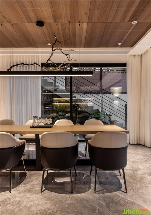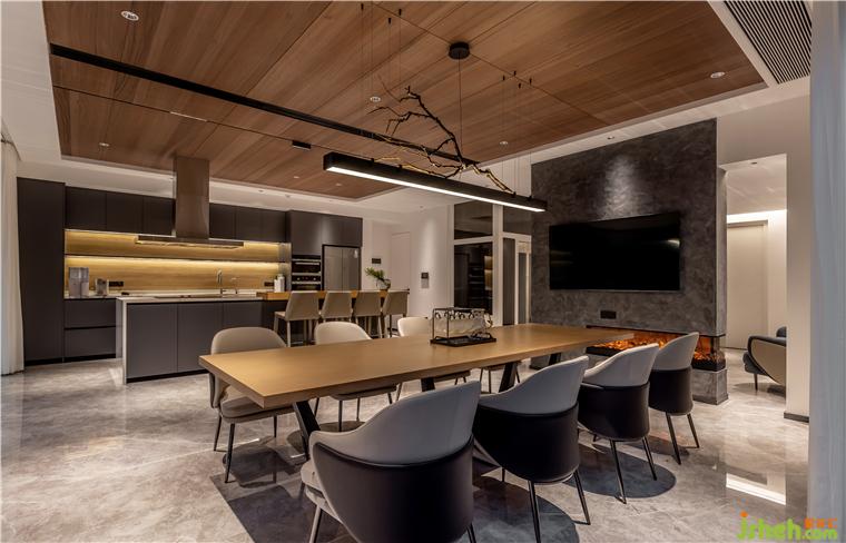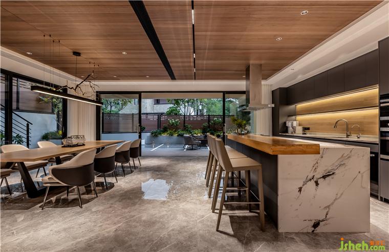 負(fù)一層為主人接待友人和家庭娛樂(lè)的空間,開放式的西廚與用餐區(qū)形成很好的社交屬性,并穿插天花天然木紋的質(zhì)感表達(dá),佛山保利云上別墅裝修設(shè)計(jì)讓餐廚空間自成一體,深淺色塊的碰撞讓空間不止是使用,而是另一種視覺(jué)的享受。