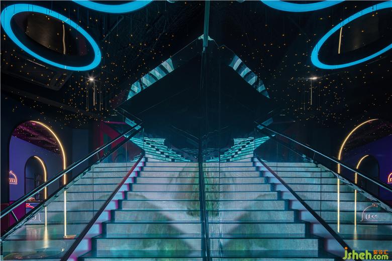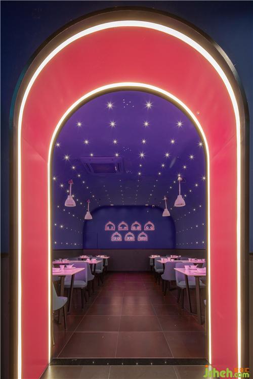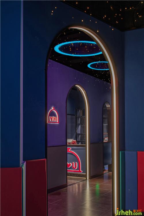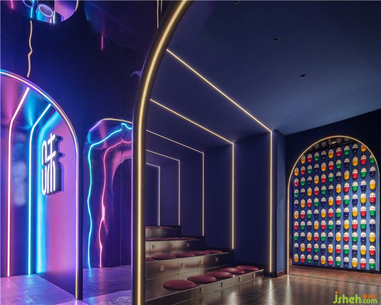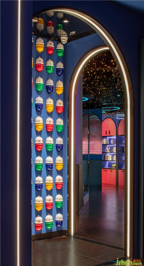 入口從品牌的機(jī)器人形象中提取出圓弧形元素,結(jié)合四周環(huán)繞的鏡面不銹鋼材料,帶給人們一種神秘跟未知感。彩色發(fā)光燈帶的運(yùn)用,打造甜蜜歡樂的視覺感受的同時(shí),呈現(xiàn)出場景的儀式感和迷幻感。