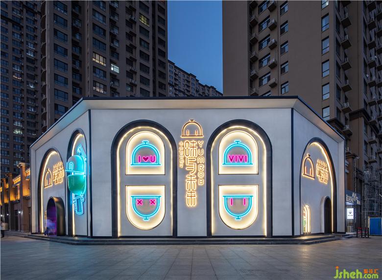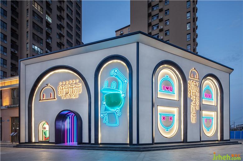 將抽象的品牌概念,轉(zhuǎn)化為可感知、可傳播的空間語言,并為商業(yè)經(jīng)營增加效益,是本案設(shè)計(jì)思考的核心。故而在門頭設(shè)計(jì)上,室內(nèi)設(shè)計(jì)師運(yùn)用了極具建筑感的形象,在不同方位立體化地展現(xiàn)“味”與“未來”。大膽鮮明的色彩布置,讓餐廳設(shè)計(jì)成為街道靚麗而醒目的存在。VIVI的卡通化IP形象不僅可以作為賣點(diǎn)吸人眼球,還可以形成自己的視覺符號,增加品牌的辨識度。