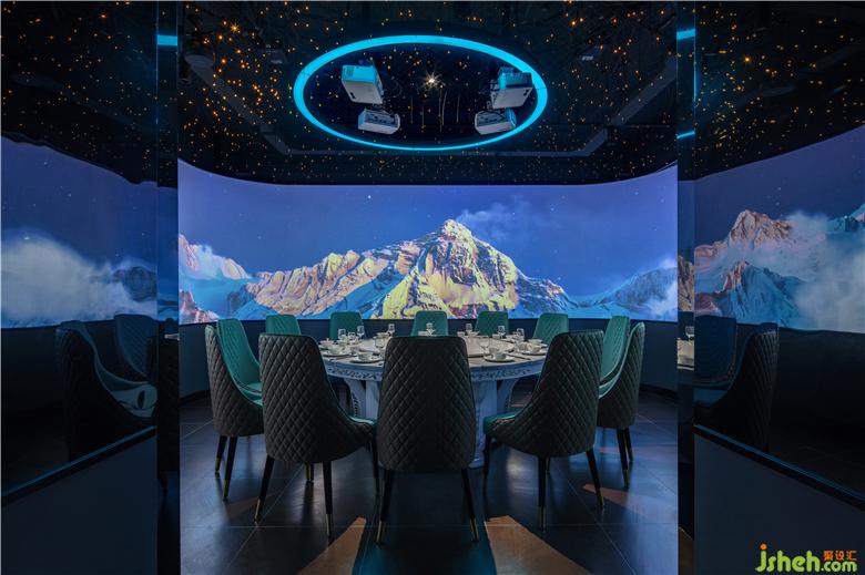包廂頂面運(yùn)用光纖燈,增強(qiáng)空間的視覺(jué)氛圍。極具未來(lái)感的全景360度立體投影,通過(guò)聲光電科技打造“沉浸式”就餐環(huán)境,為顧客呈現(xiàn)出了繽紛多元且富含戲劇性的視覺(jué)效果。