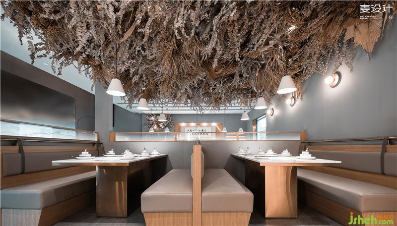 經(jīng)過前臺,置身用餐區(qū)域,空間頂面利用大量干花枝葉垂掛裝飾,與店內(nèi)的藝術(shù)裝置構(gòu)成一幅寫意的畫作,如此帶有復(fù)古情懷的視覺沖擊與場景體驗(yàn)感,令人矚目,引導(dǎo)顧客拍照打卡從而實(shí)現(xiàn)自主傳播的效果金華餐廳設(shè)計(jì)。