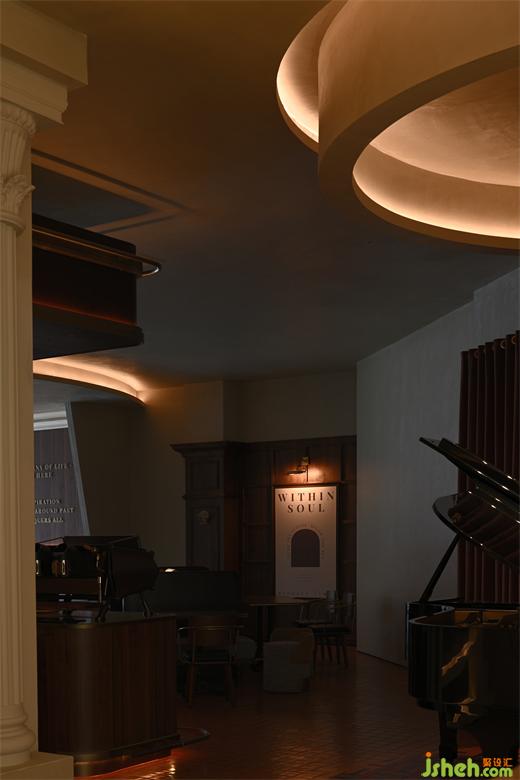 While modernism places an emphasis on geometry and a sense of reality, classicism pays more attention on order and symmetry. Recombining classicism and modernism is required to align history with reality. The grand piano may be heard resonating off the pillars of the arch at the corner of the lobby. Time moves slowly as the steps become deeper and deeper, which is akin to a dialogue across time, bringing the exquisiteness of the European Middle Ages design concept to life in the setting.