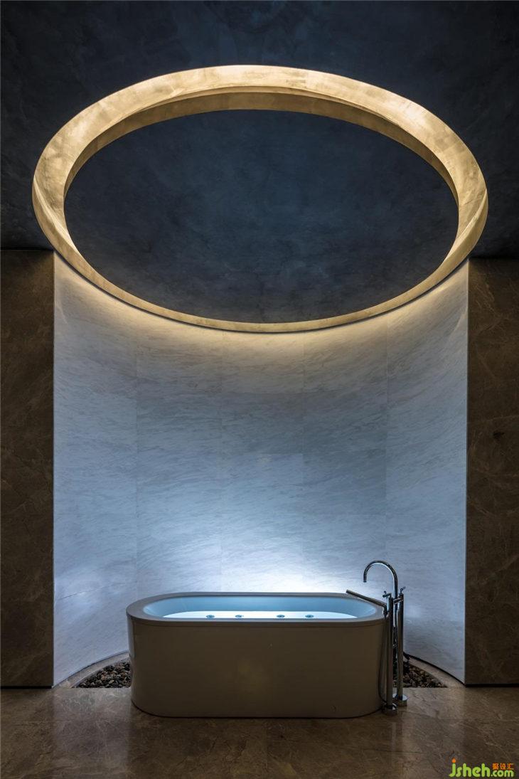 他將SPA區(qū)的設(shè)計原型定為地底溶洞,以深邃懸浮的震撼自然之景打造室內(nèi)空間,塑造出有形立體的混凝土立面。曲線雕刻的立面形體持續(xù)延伸,深沉地“懸?!庇诘孛嬷希彰饔衷鰪娏诉@種建筑張力,猶如置身溶洞。