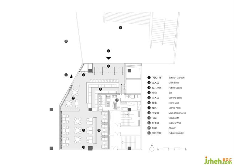 如何連接入口空間與下沉廣場(chǎng)是餐廳設(shè)計(jì)的起點(diǎn)。