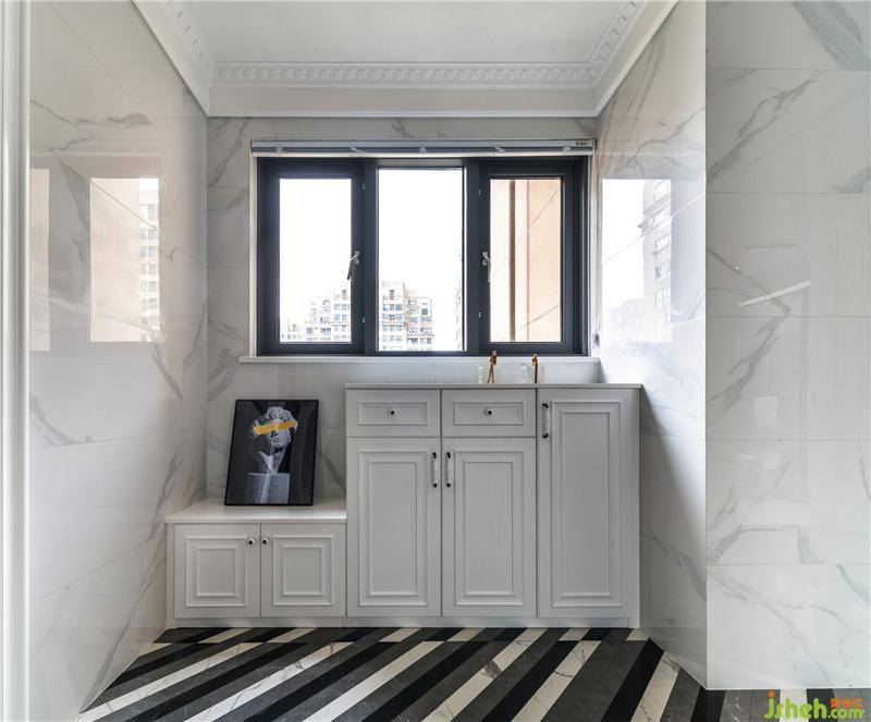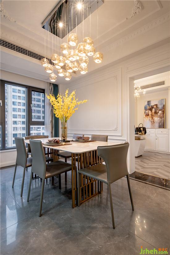 餐廳不再需要傳統(tǒng)的邊吊和射燈,如夢幻泡沫般的玻璃藝術(shù)吊燈,一樣可以滿足空間照明,日落黃昏時的晚餐會更顯得有浪漫情調(diào),嫩灰色的餐椅、亮黃色的花卉。地面選用灰度太陽石系列瓷磚,搭配經(jīng)典黑大理石瓷磚走