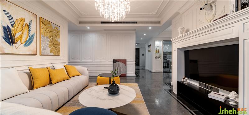 干凈優(yōu)雅的色彩基調(diào)搭配白色調(diào)的壁爐下與黑色電視機柜,顯得簡潔而雅致。深色的單人椅呼應(yīng)著空間中的灰度,光線透過紗簾灑進室內(nèi),使得米色沙發(fā)顯得格外溫馨和舒適。