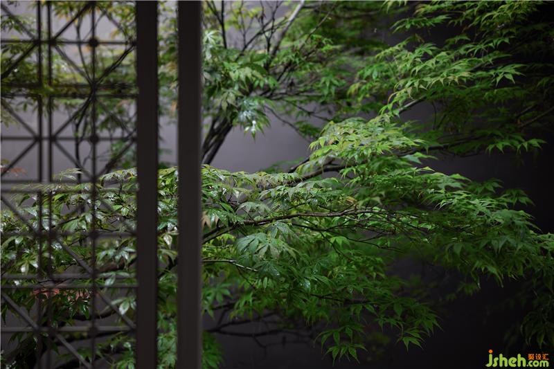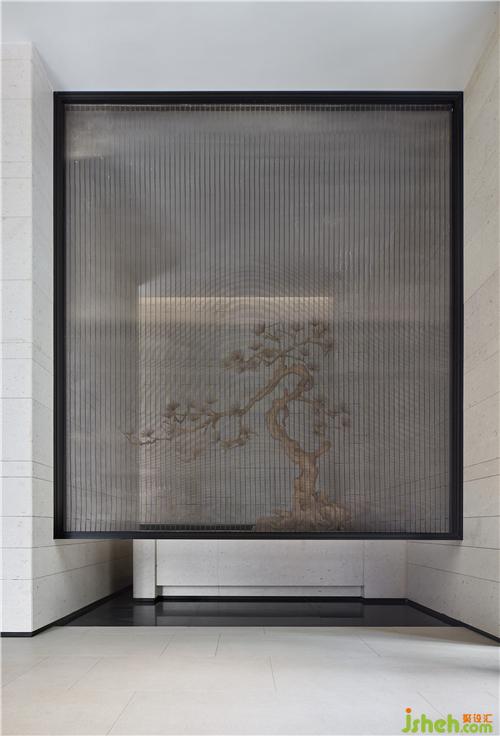 前廳轉(zhuǎn)軸以一株柏松為飾,因一朦朧壁屏,面墻而立,依稀有物,空而不空,從而生出"實(shí)景清而虛景現(xiàn)"之感。