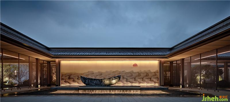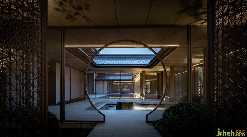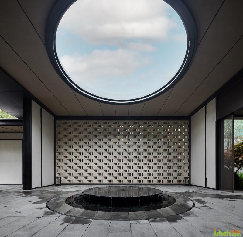 內(nèi)空間則采用“四水歸堂”設(shè)計(jì),其建筑風(fēng)格理念來源于浙江文化傳承天人合一的理學(xué)思想。移步換景,重檐交疊之下的一方蔚藍(lán)天空,似乎框住了一方天地,獨(dú)有一番江南人文之下的氣韻。