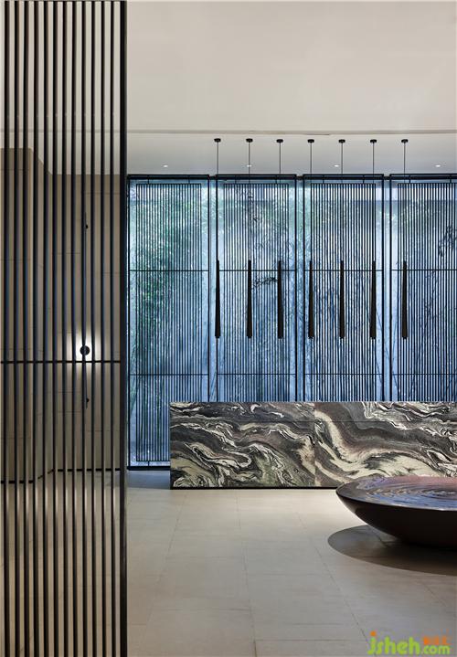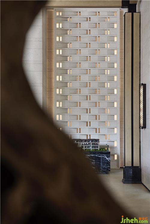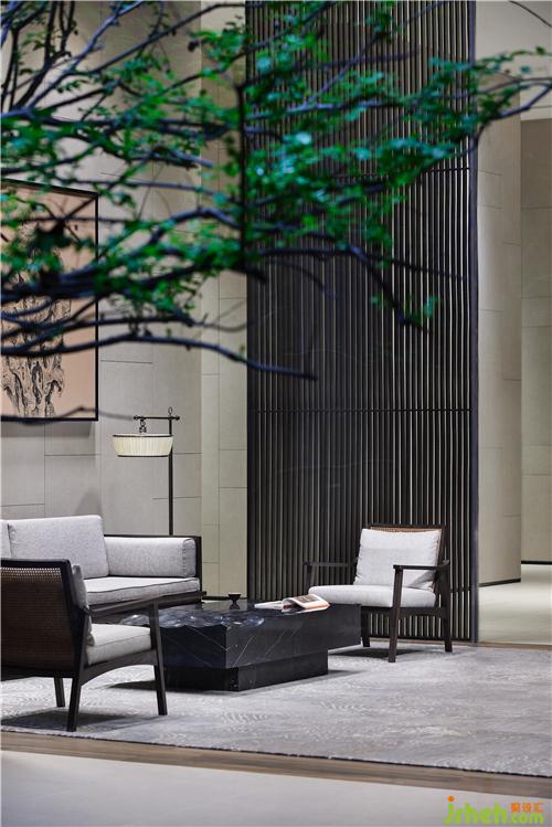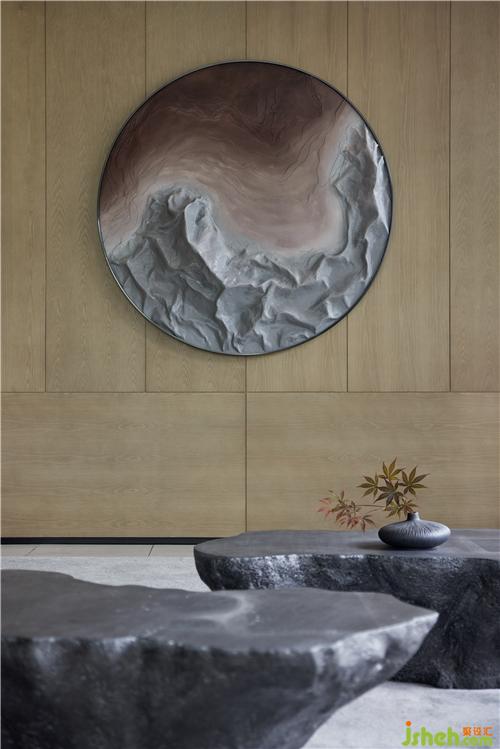 地下一層接待廳容儀端然,前臺以青銅瘦竹為屏,以當(dāng)代的形式,轉(zhuǎn)化為空間的藝術(shù)感染力,予人舒朗身心的氛圍南京售樓處設(shè)計(jì)。場域中間圓盤的置入令規(guī)整方正的接待廳增添一抹靈動(dòng),營造出悠遠(yuǎn)空靈的中式意境,塵囂俱拋。