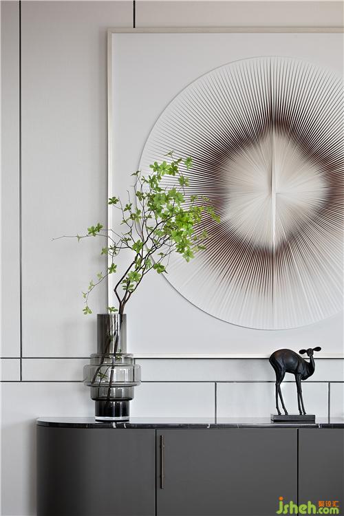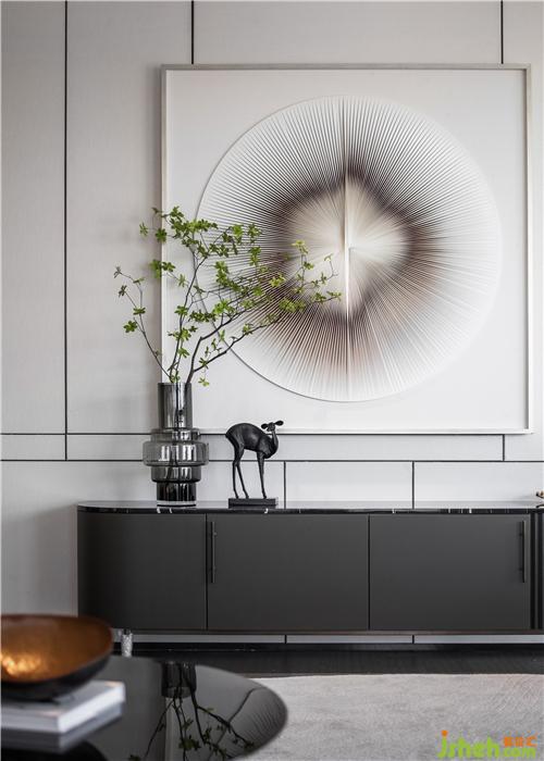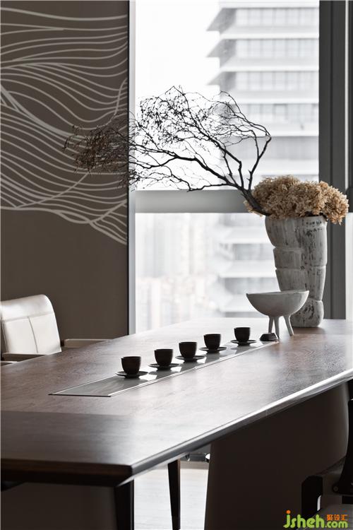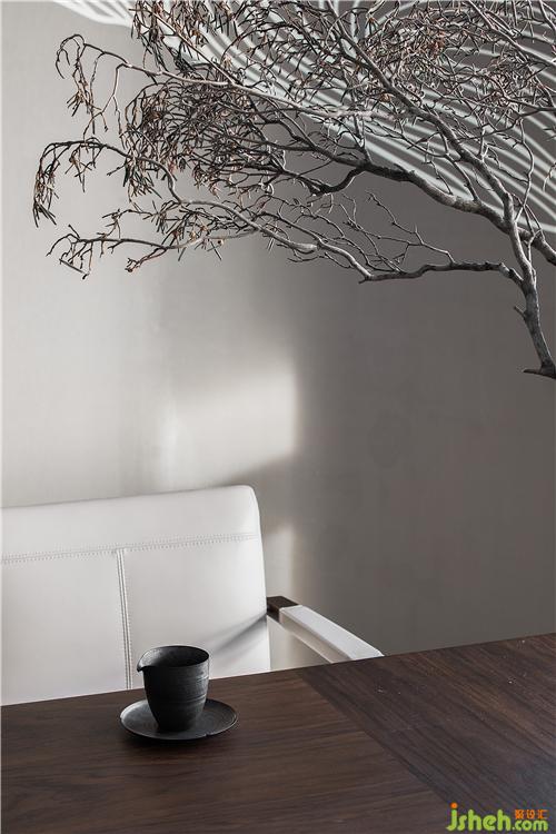與室外景色相融的茶室一角,在保留茶文化本源的基礎(chǔ)上“不剝離其韻”,采用現(xiàn)代設(shè)計(jì)手法,摒棄多余的矯飾。闊景寬窗,以光滌塵,和諧共生。一杯茶、一本書,晨沐朝霞,夜觀星斗,咫尺乾坤盡在眼前。