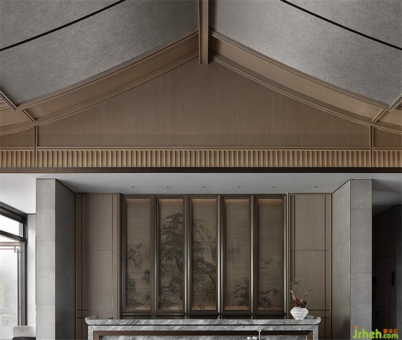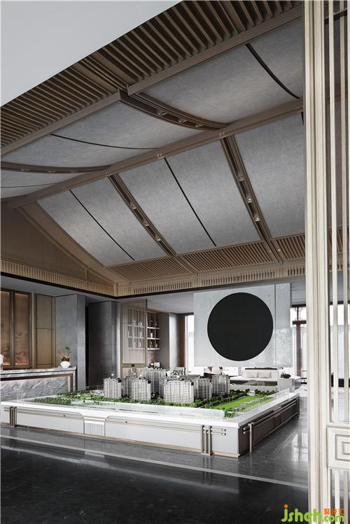 沙盤區(qū)上方采用中國(guó)傳統(tǒng)的坡屋頂元素,用現(xiàn)代手法進(jìn)行重構(gòu),展現(xiàn)了傳統(tǒng)與現(xiàn)代設(shè)計(jì)的共鳴。透過木色線條格柵,材質(zhì)與光影的動(dòng)態(tài)產(chǎn)生交互,凝結(jié)出畫面的豐盈意境。