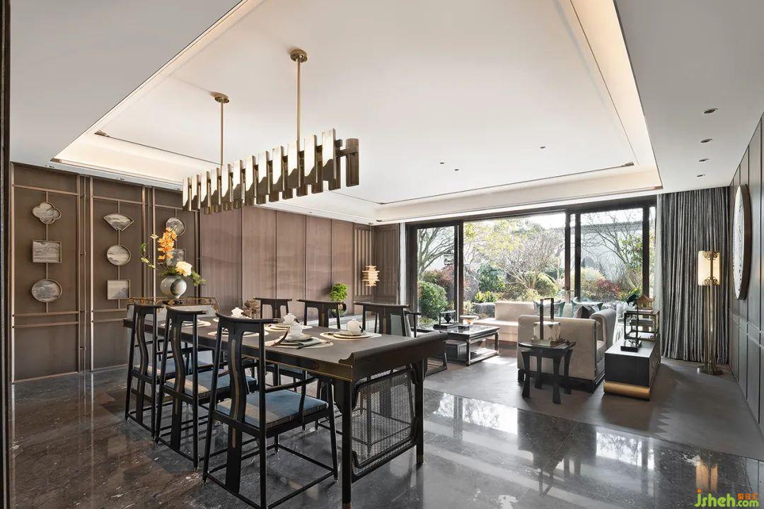 踏入室內(nèi),映入眼簾的是大幅飄窗打通室內(nèi)與戶(hù)外景致的視覺(jué)聯(lián)結(jié)使之更加開(kāi)敞,和煦日光,將清幽寫(xiě)意娓娓道來(lái)。室內(nèi)設(shè)計(jì)整體為王府中式設(shè)計(jì),不經(jīng)意間將生活、詩(shī),遠(yuǎn)方連成一體,召喚每一位歸家的人。室內(nèi)整體采用中式元素融入考究而克制的細(xì)節(jié),客廳背景金屬網(wǎng),在里面加上了一副娟絲雕刻的山水畫(huà),其滲透出的遠(yuǎn)山層疊與金屬質(zhì)感的動(dòng)靜相襯,賦予流動(dòng)的語(yǔ)言,增添不同層次的感官體驗(yàn),讓其形成虛與實(shí)的中式意境。
