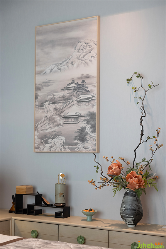 客廳與次臥木質屏風的隔斷,進一步打開空間格局。次臥寧靜素雅,極具東方色彩元素的陳設,陽光透過紗窗照射進來,增添層次感,營造創(chuàng)造出一方安寧的休憩場所。