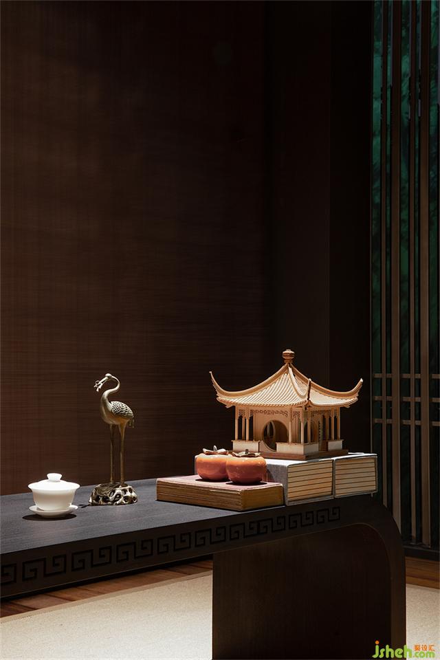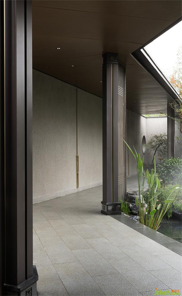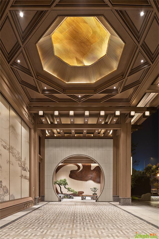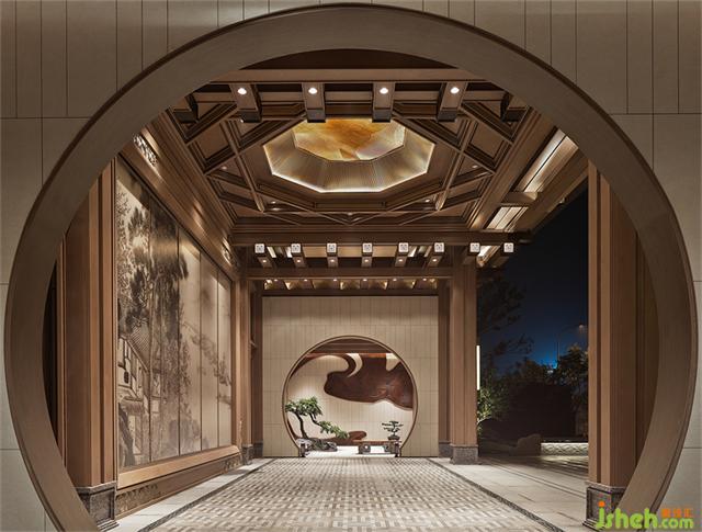 月洞門圓潤(rùn)如月,暗含九九歸一寓意圓滿之意。營(yíng)銷中心設(shè)計(jì)師運(yùn)用黃金分割的手法將月洞門與整個(gè)墻體的內(nèi)面進(jìn)行組合、切割,以虛實(shí)結(jié)合的手法營(yíng)造一個(gè)半圍合的空間,讓靜止的空間內(nèi)充滿靈動(dòng)的柔美。一枝松枝橫斜,樹影婆娑構(gòu)出“明月松間照”的詩意畫面。