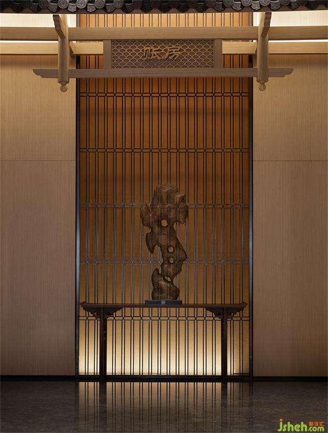 步入接待廳,格柵屏風(fēng)滲透出影綽的遠(yuǎn)山層疊與水紋肌理的臺面動靜相襯,營銷中心設(shè)計(jì)賦予流動的語言,增添不同層次的感官體驗(yàn)。游走于空間線條之中,無限延伸、擴(kuò)展空間與藝術(shù)交織后呈現(xiàn)詩意氛圍。