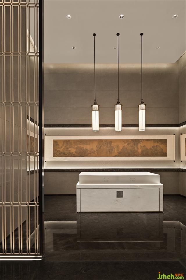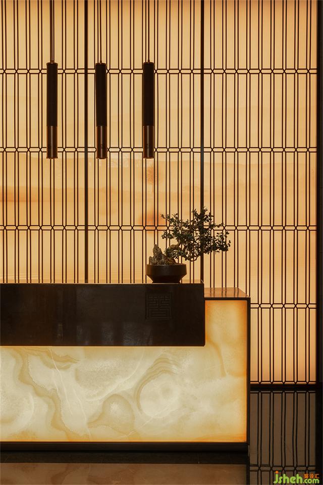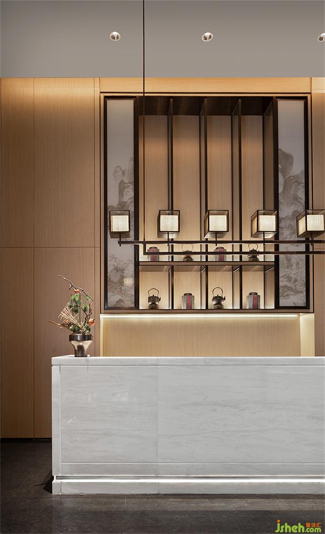 水吧區(qū)在極簡的乳白色大理石臺面融入了別具一格的中式陳設(shè)美學(xué),使空間彌漫著簡雅氛圍。