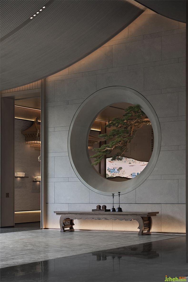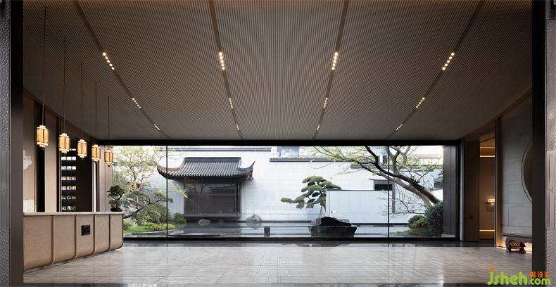 前臺一側(cè),會所設(shè)計以虛實結(jié)合的手法營造一個半圍合的空間,一方池水,鏡面澄澈,一枝松枝橫斜,樹影婆娑,一池一樹一景,二維畫卷與三維微觀園林水景互為映照,形構(gòu)出靜謐空間氣質(zhì)。
